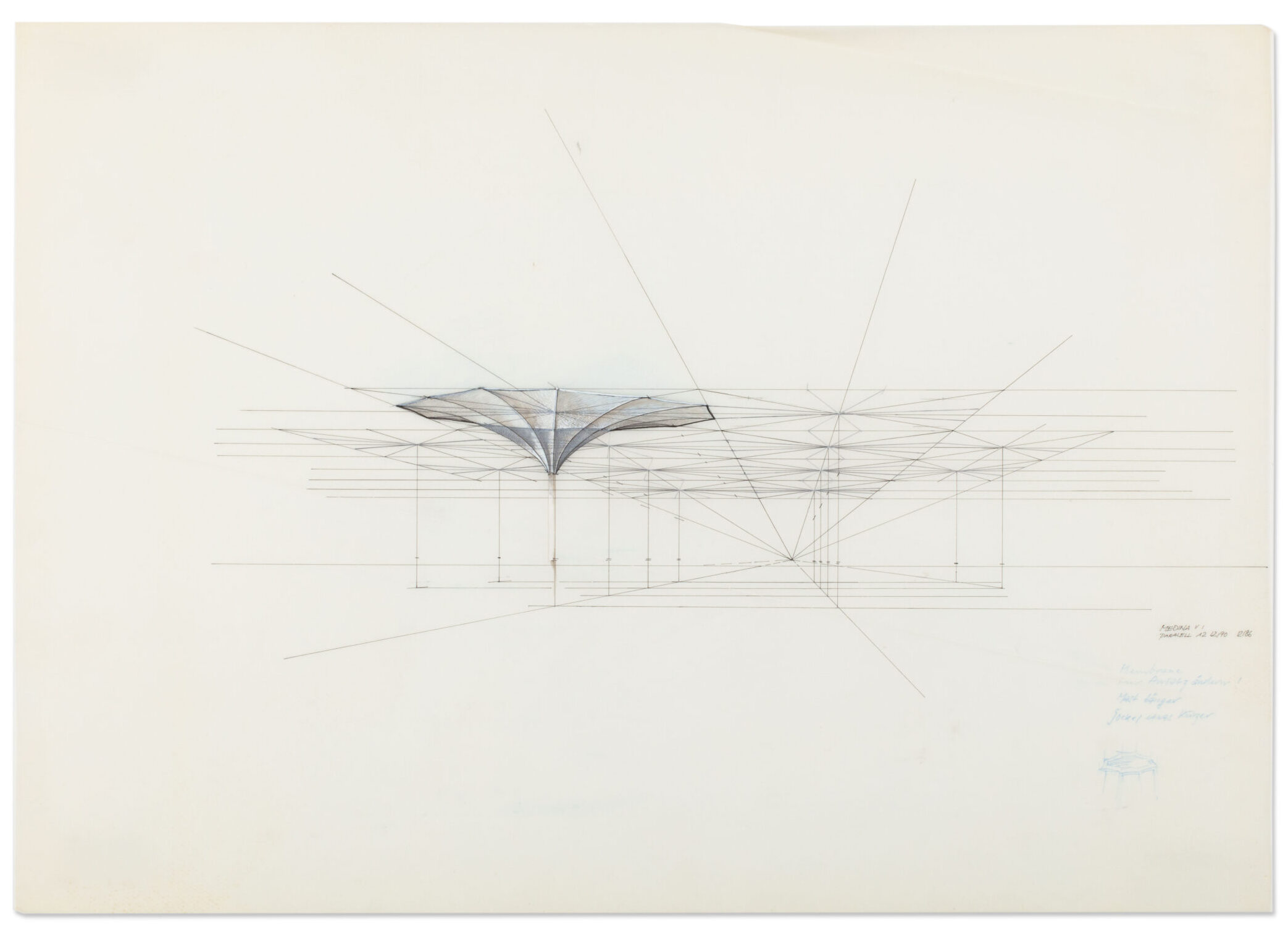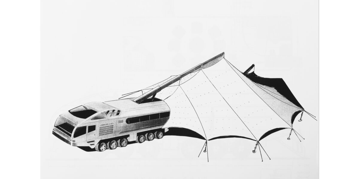 Rasch’s Stuttgart archive pushed that instinct to another scale. Here, the material was almost vaulted away, yet just as alive with possibility. Drawers and cabinets opened onto layer upon layer of hand-drawn overlays charting the choreography of domes, mechanical ballets shifting from shade to sky in seventy seconds; hand-painted renderings of 17×18 meter umbrella units and tent prototypes; and white cotton structures designed for a Pink Floyd tour in 1977, tested in Cleveland while whispering echoes of their desert fates.