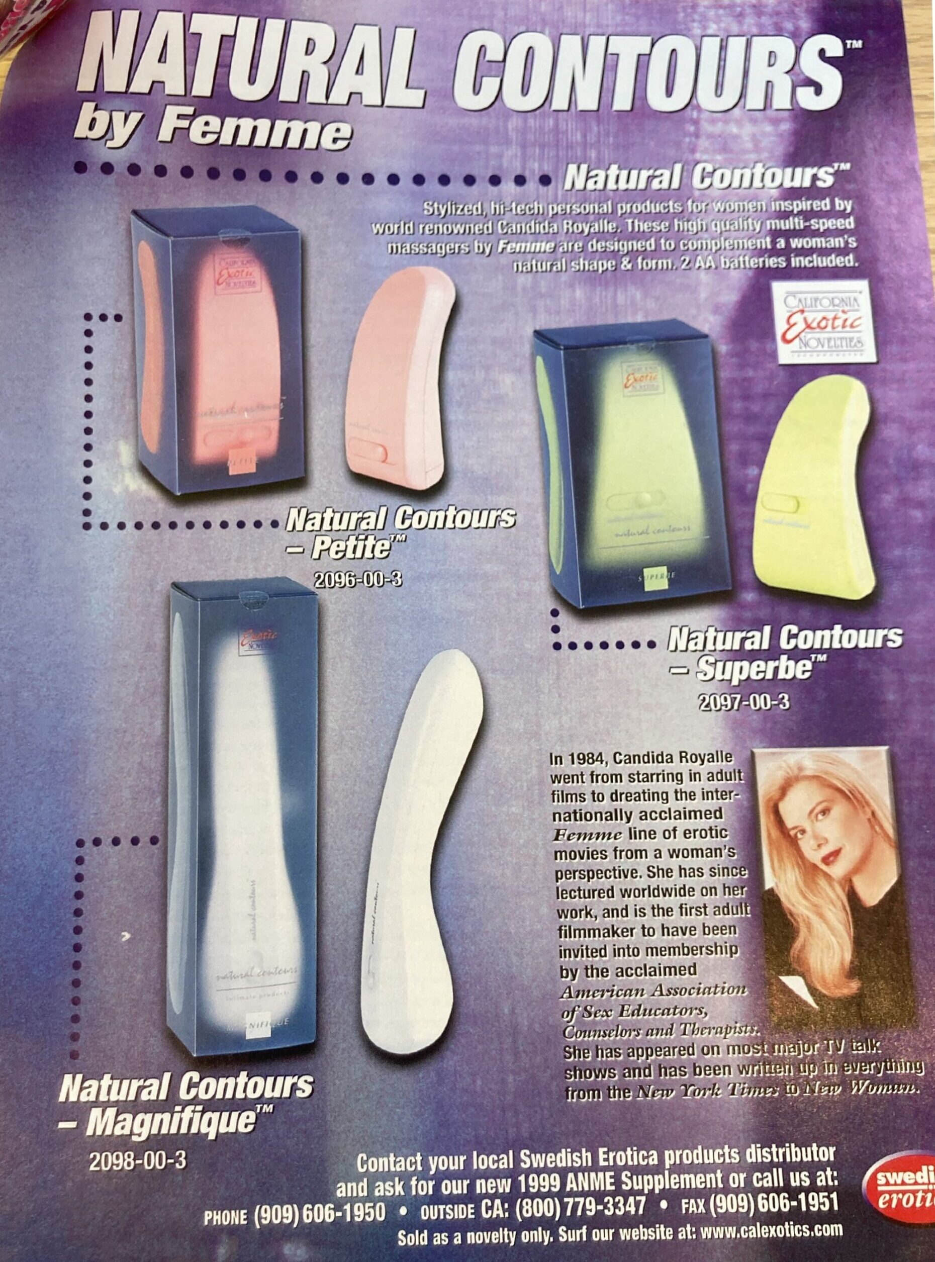 “We were the first company to create…vibrators…that sat on the woman’s pubic bone for direct clitoral stimulation,” Spellman claimed. Airs confirmed that they were one of the first companies to do so.“Natural Contours: Pioneer and Guide,” EAN: European Adult News, January 2009, 26.× A description of the vibrators in an Adam and Eve catalog from the mid 2000s declared: “No one needs to know that your sleek Euro-designed ‘hand-held’ device is not a cell phone or TV remote.”Adam and Eve Catalog, Candida Royalle Papers, Box 101, folder #10. Schlesinger Library, Radcliffe Institute, Harvard University, Cambridge, Mass.×