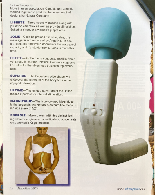 They called their company Natural Contours, and their aspirations went beyond merely creating new shapes for vibrators: they aimed to have vibrators go mainstream: stocked in Wal-Mart and advertised in Cosmopolitan.