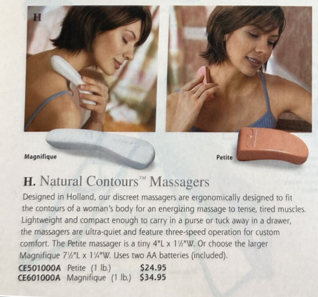 Their advertising straddled a difficult line—aiming to be both feminist (targeting single women) and traditional (appealing to couples who may have feared vibrators could torpedo their relationship). “Many women are seeking ways for women to safely and privately explore their capacity for pleasure as well as to relieve stress in their busy lives. Others find that introducing a personal massager improves a couples’ intimacy and communication,” a Natural Contours vibrator brochure explained.