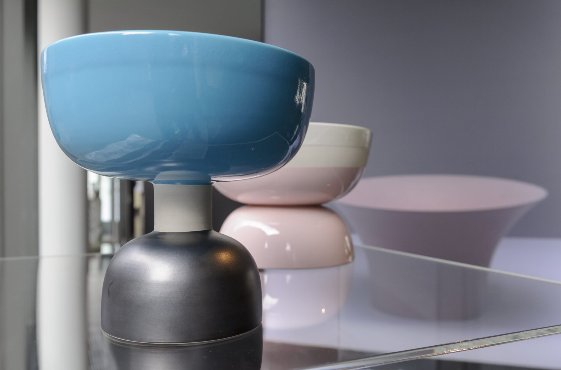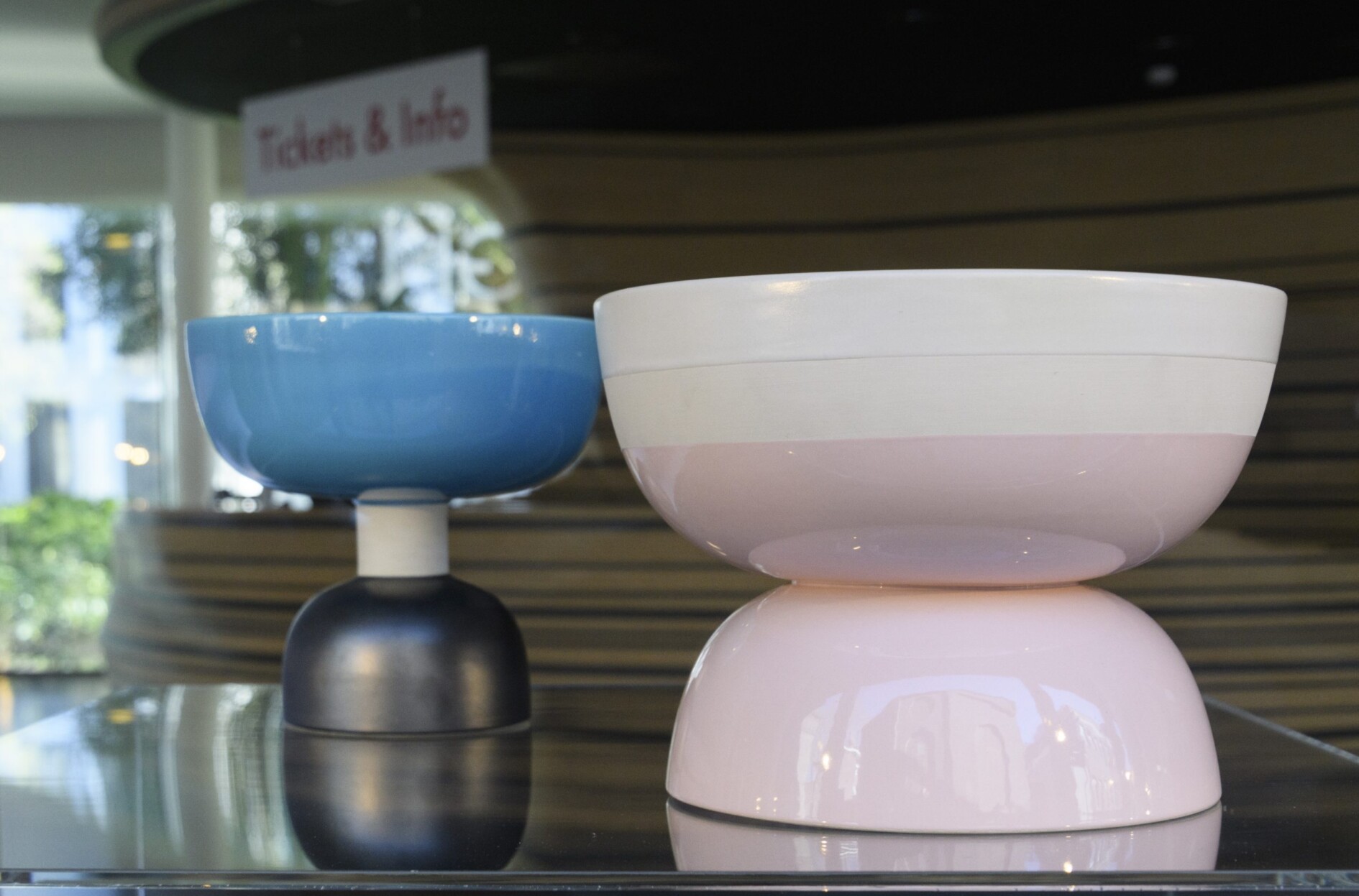 Dit zijn twee van de diabolo-achtige schalen van aardewerk die Ettore Sottsass in de jaren vijftig van de vorige eeuw ontwierp. Het formaat van schaal en voet varieert steeds. Soms is er een cilindrisch verbindingsstuk gebruikt waardoor de schaal iets statiger wordt. De glazuren zijn vaak pastelkleurig en verlenen de schalen iets kwetsbaars en cerebraals. De Italiaanse architect, designer, en theoreticus Ettore Sottsass (1917-2007) heeft altijd een vernieuwende blik gehad. In 1981 was hij een van de oprichters van het postmodernistische Memphis, een groep designers die met radicale ontwerpen, felle kleuren en materialen als laminaat het klassieke onderscheid tussen hoge en lage cultuur wil doorbreken. Sottsass houdt ook van klei. Het is voor hem de oerdrager van cultuur. Sinds 1956 heeft hij honderden keramische stukken ontworpen, soms door hemzelf vervaardigd, meestal uitgevoerd door derden op basis van zijn prototypes. Hij gebruikt daarvoor de meest gangbare soorten klei en glazuren en komt zo tot een hedendaagse en vernieuwende beeldtaal. Design Museum Den Bosch heeft meer dan 50 verschillende werken van Sottsass in de collectie.