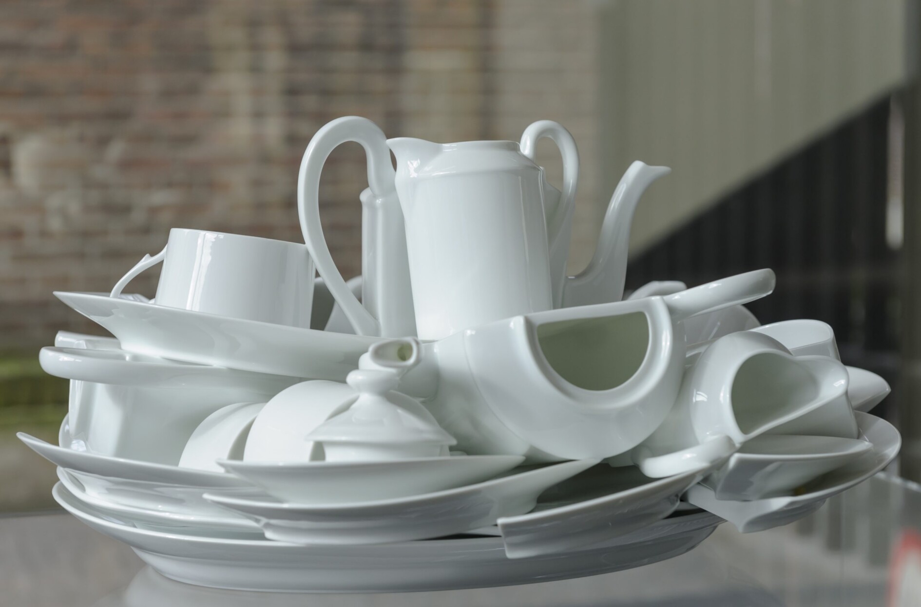 Een machinaal gegoten en aan elkaar gebakken centrepiece, samengesteld uit diverse gestapelde serviesonderdelen. Dit humorvolle servies ontwierp Arman voor de gerenommeerde serviesfabrikant l’Ancienne Manufacture Royales de Limoges. De in Nice geboren kunstenaar Armand Fernandez (1928-2005) studeerde wiskunde en filosofie. In 1947 ontmoet hij Yves Klein, wie hij vervolgens assisteerde bij zijn happenings. In 1960 richt hij samen met onder andere Klein, César en de kunsthistoricus Pierre Restany de kunstbeweging Nouveau Réalistes op, een op de Amerikaanse Pop Art gelijkend initiatief. Arman werkt meestal met gemengde technieken. In de jaren vijftig zorgt hij voor opschudding met zijn zogenaamde Accumulations. Dit zijn plexiglas kastjes die hij vulde met series van dezelfde materialen. Variaties op dit principe ontstonden als autonome ‘sculpturen’ en sieraden. In de jaren zestig van de vorige eeuw maakt hij zijn Coupés (in stukken gesneden) en Coléres (in stukken gesmeten) objecten. Deze bewerkingen paste hij vervolgens ook bij sommige van zijn keramische werken toe, zoals bij As in the Sink II.