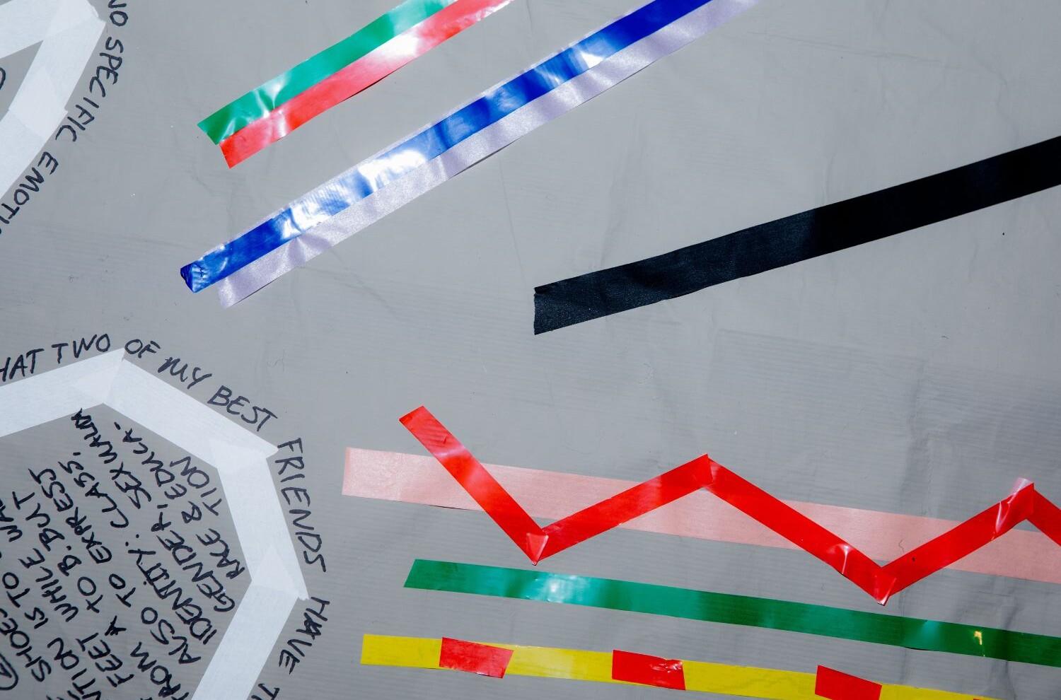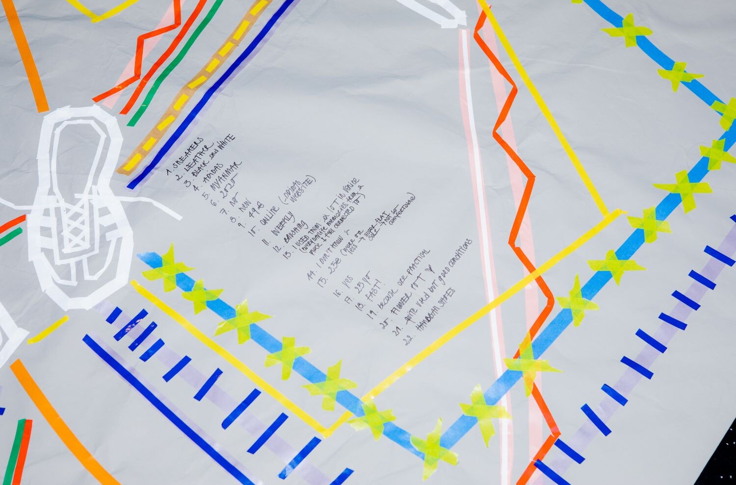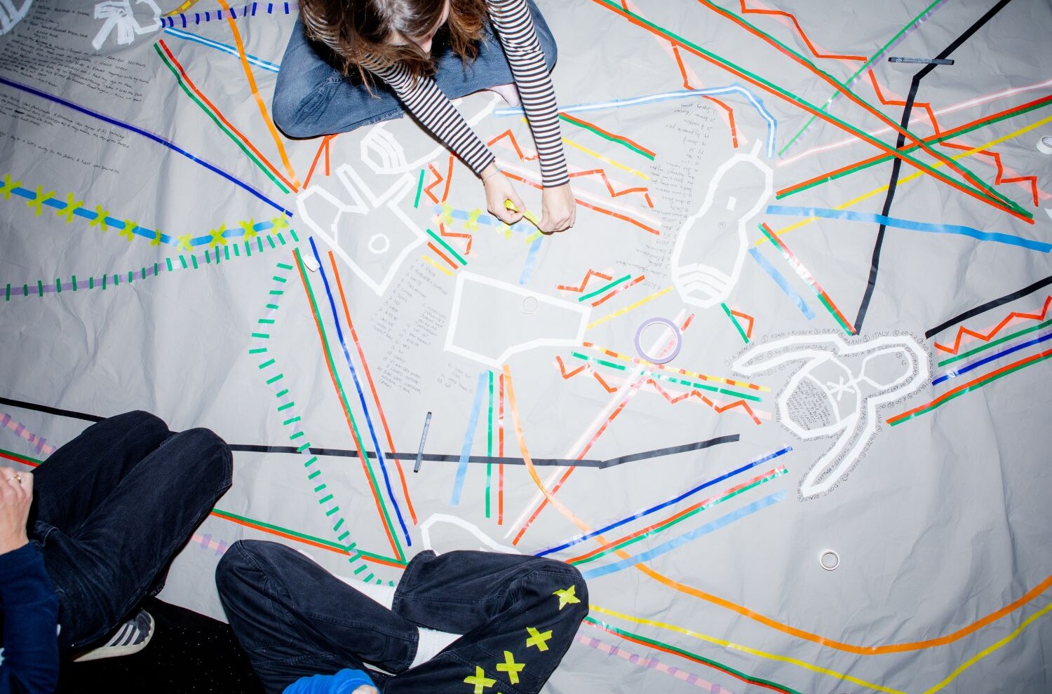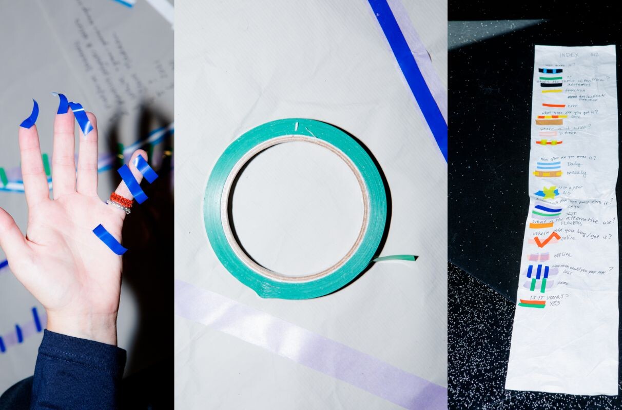 Tijdens de PORTAL workshop werden relaties zichtbaar door iets anders dan taal, het wordt zichtbaar door het tekenen van een kaart. Of misschien is een kaart een soort taal, dat weet ik niet zeker. Sommige mensen die deelnamen aan het tekenen van de kaart stelden zich voor dat hun schoenen ook gebruikt zouden kunnen worden  als bloempot of vaas. Individueel bracht de vraag “op welke manieren kan dit voorwerp nog meer worden gebruikt??” ons aan het denken aan planten en bloemen. Als onze verbinding wordt getekend met oranje tape verschijnt een collectief verlangen om in deze voorwerpen iets levends vast te houden dat niet ons eigen lichaam is.